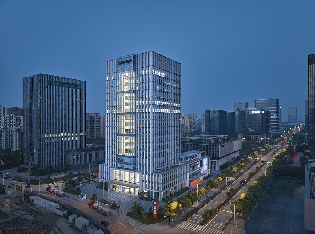 項(xiàng)目位于蘇州工業(yè)園區(qū)旺墩路沿線,總體布局以城市界面和肌理作為切入點(diǎn),建筑東 立面塔樓居于裙房中央布置,形成儀式感和標(biāo)志性較強(qiáng)的對(duì)稱界面,以建筑語(yǔ)匯突出 浙商銀行的企業(yè)形象。