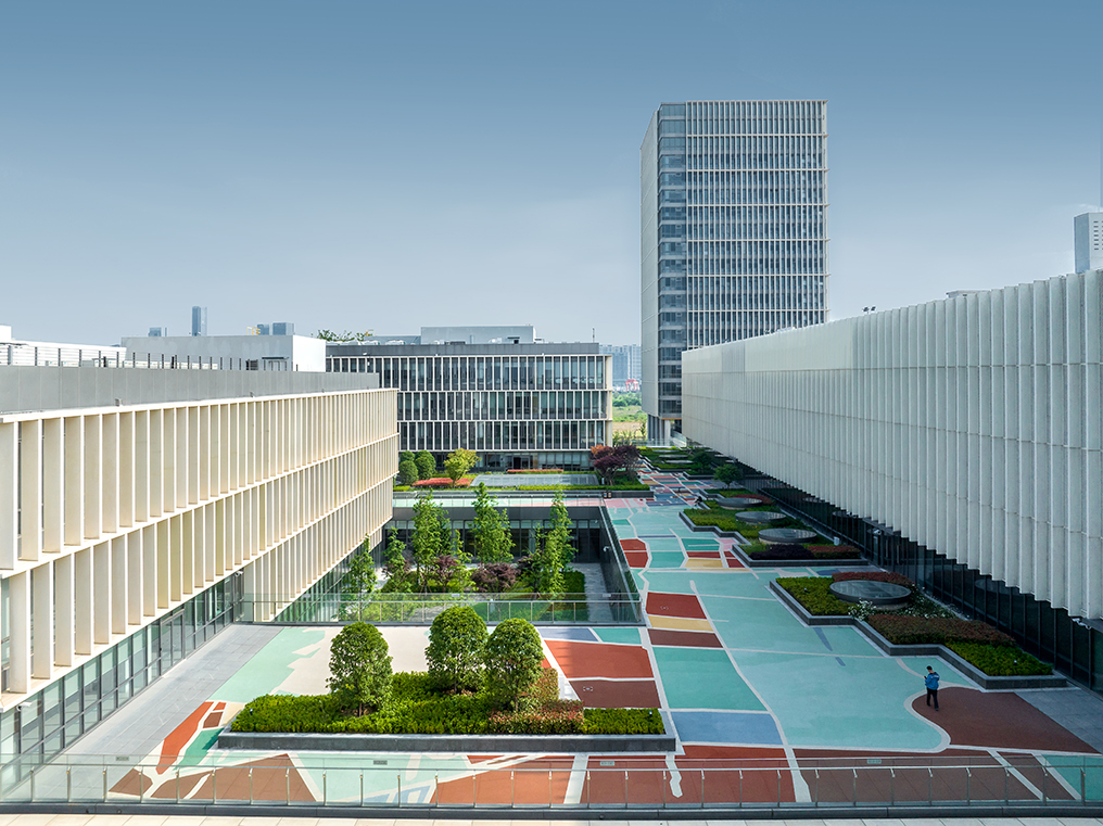 薈同校園兩個出入口附近即設(shè)置了機動車坡道,方便教師工作人員、校車及家長臨時車輛引入地下車庫,保證校園處于無車化。校園多設(shè)置鋪裝,隱形消防車道及消防撲救面滿足消防突發(fā)狀況的使用要求。地下車庫設(shè)置了學(xué)生接送的專用門廳,增加了校園地下的第二出入口,并方便學(xué)生日常接送。校園入口設(shè)置節(jié)慶廣場;各建筑單體圍合了中央庭院,根據(jù)學(xué)生年齡設(shè)置了不同風格的內(nèi)庭院景觀;建筑屋面設(shè)置了屋頂花園及運動場地,將綠化立體化,豐富了景觀層次。