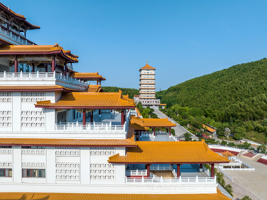 項(xiàng)目位于宜興市大覺寺寺院內(nèi),周邊資源優(yōu)越,依山傍水,形成獨(dú)特的地域景觀特色,是現(xiàn)代與古文化的結(jié)合,具有仿古的江南建筑風(fēng)格,通過佛教文化的引入,傳播佛教思想。建筑依山而建,整體形態(tài)依據(jù)山勢逐步遞進(jìn),與自然融合的同時(shí)又不乏佛教建筑莊嚴(yán)肅穆的氛圍。整體建筑風(fēng)格恢弘大氣,五層退臺(tái)的形式與佛教五乘教法相呼應(yīng),充分展現(xiàn)了中華民族傳統(tǒng)文化的博大精深與深厚底蘊(yùn)。