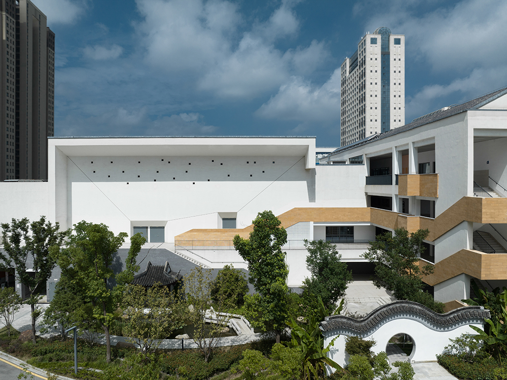 傳統(tǒng)的條形教室以走廊串聯(lián)的模式限制了校園空間格局形式并不適用于本方案,在日照的限制下,以功能環(huán)串聯(lián)交融為構(gòu)成手段的布局,不僅將集約高效率的教學(xué)模式演繹透徹,還創(chuàng)造出多樣的廣場(chǎng)、庭院空間。