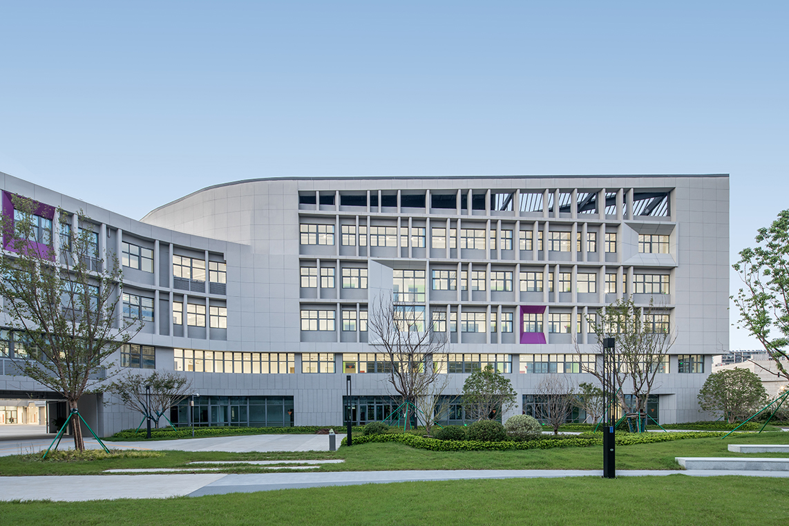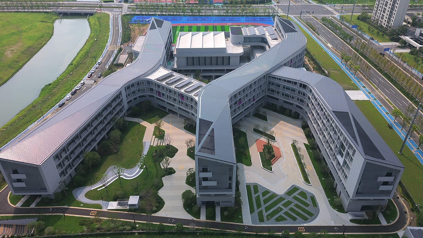 設(shè)計(jì)創(chuàng)新性地抽取了包含專業(yè)教室的綜合樓區(qū)塊,將其融入帶有最大50度轉(zhuǎn)角的曲折走廊設(shè)計(jì)中。這一做法一方面避免了東西向教室的布局,另一方面在提高建筑整體密度的同時(shí),最大化了室外活動(dòng)區(qū)域的面積。通過引入下沉廣場(chǎng)、退臺(tái)式布局以及出挑露臺(tái)等設(shè)計(jì)元素,進(jìn)一步豐富了校園室外活動(dòng)空間的體驗(yàn)層次,為孩子們?cè)鎏砹颂剿髋c發(fā)現(xiàn)的樂趣。