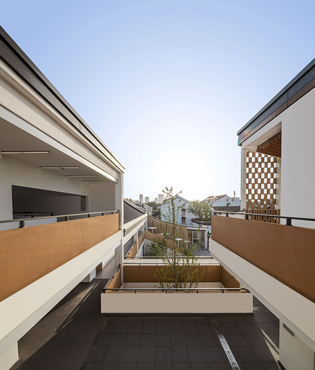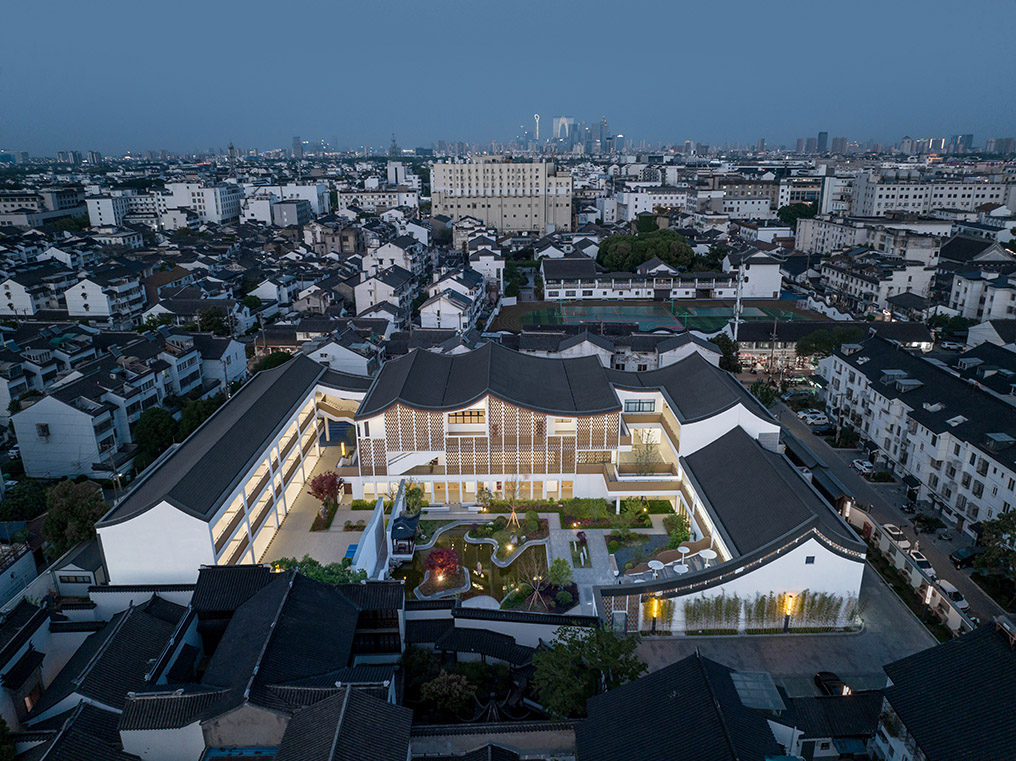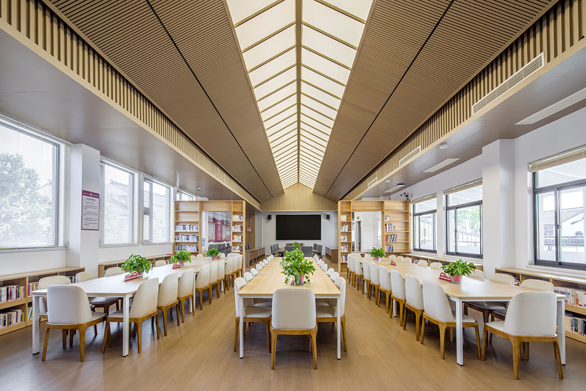 項目秉承“傳承與創(chuàng)新”的理念,在尊重古城風貌和保護周邊控保建筑的前提下,探索新中式學校建筑風格。設計通過對地下空間的利用、相同尺度空間的疊合、立面手法削弱大體量空間尺度感等方式,合理巧妙的把新校區(qū)大尺度功能空間與古城區(qū)小尺度街坊融合在一起,彼此間并不突兀。建筑通過圍合的方式在場地內部留出一處內院,與控保建筑隔墻呼應,結合古城風貌特色打造校園文化園林,讓新建學校與古城街坊融為一體,打造功能完善、環(huán)境優(yōu)美的現(xiàn)代化校園。