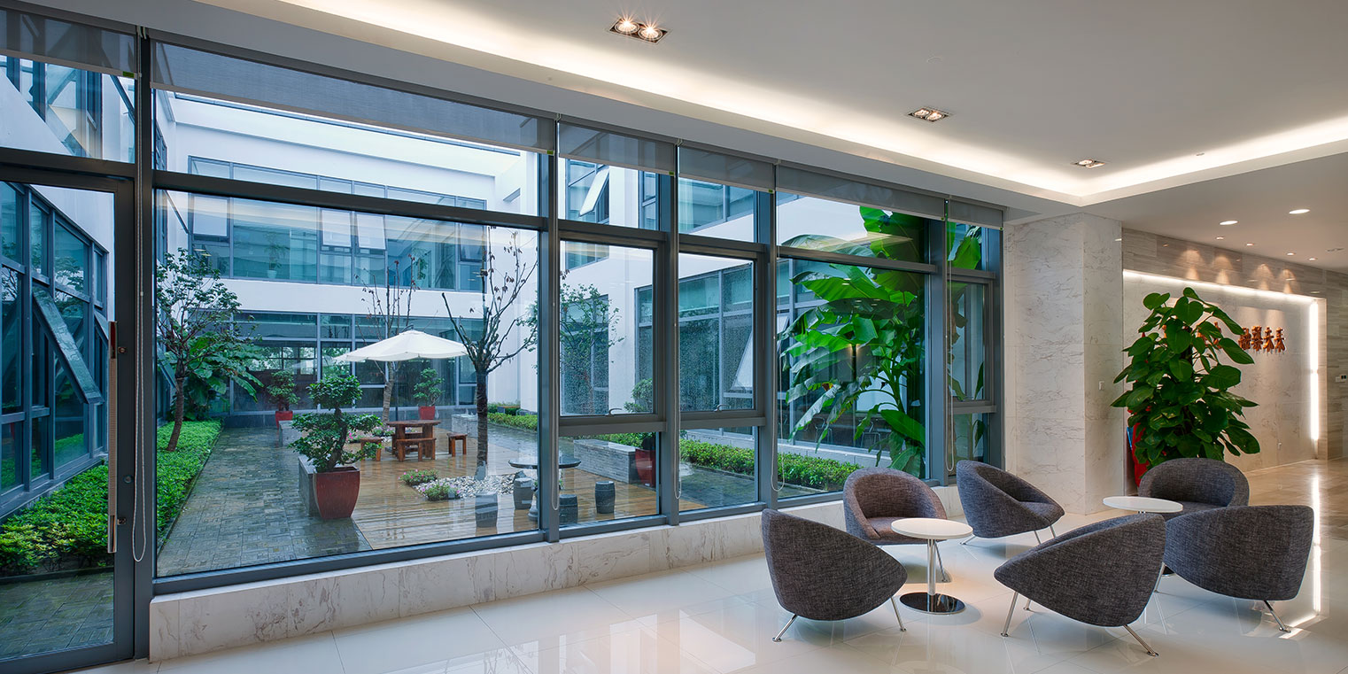 星海街 9 號(hào)項(xiàng)目改造前原有建筑為一個(gè)面積為 6800 平米的單層工業(yè)廠房。設(shè)計(jì)保留了原有建筑輪廓和全部結(jié)構(gòu),利用了原有廠房較高層高的特點(diǎn),將整個(gè)空間分為兩層。建筑平面中間設(shè)置兩個(gè)中庭、將原有的屋面固定采光孔改造為可開(kāi)啟的通風(fēng)采光孔,南立面和西立面增加生態(tài)遮陽(yáng)走廊等一系列措施有效的解決了自然通風(fēng)、自然采光和生態(tài)遮陽(yáng)。