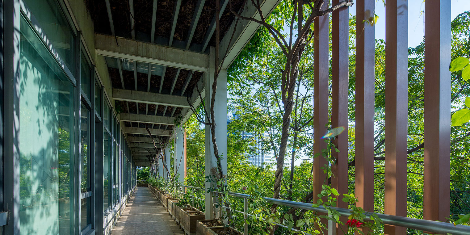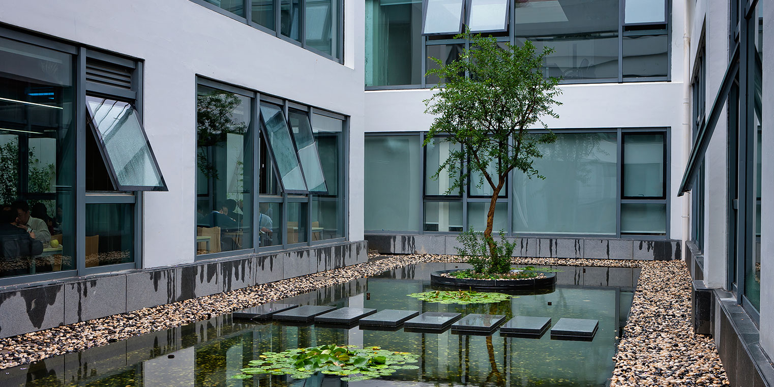 改造后的辦公樓被重重綠意包裹,開(kāi)放庭院貫穿其中,藤架長(zhǎng)廊懸于外墻,高大林木環(huán)立四周。在封閉的廠房建筑中,架構(gòu)起由內(nèi)而外的三重自然空間,江南的傳統(tǒng)氣質(zhì)自然彰顯。這些無(wú)處不在的綠色空間,提供了人與自然親密接觸的可能。在這里,可以放松心情愉悅工作,無(wú)限創(chuàng)意隨時(shí)迸發(fā)。