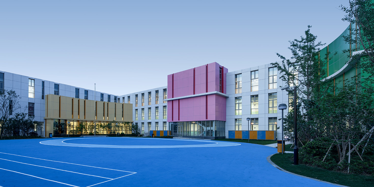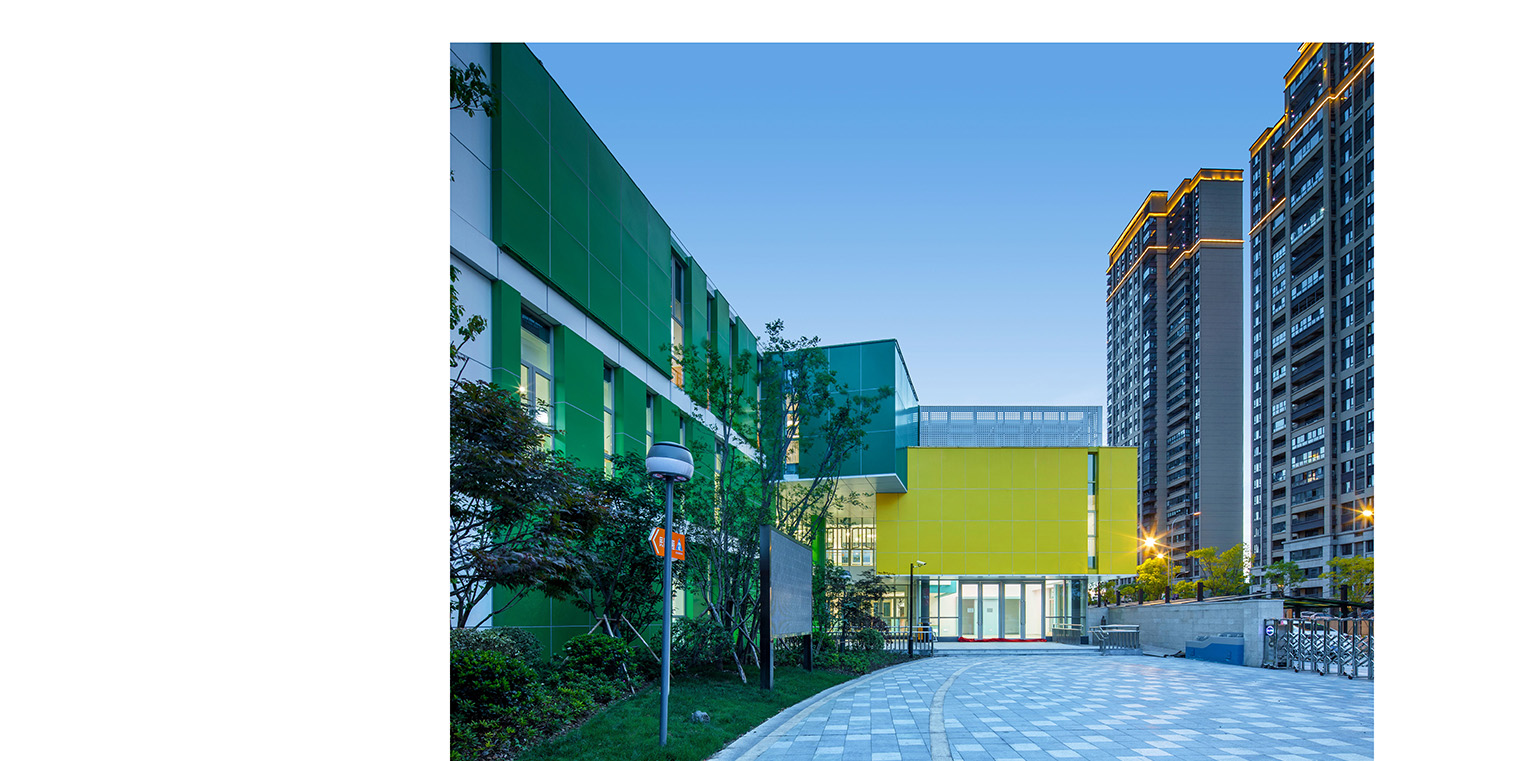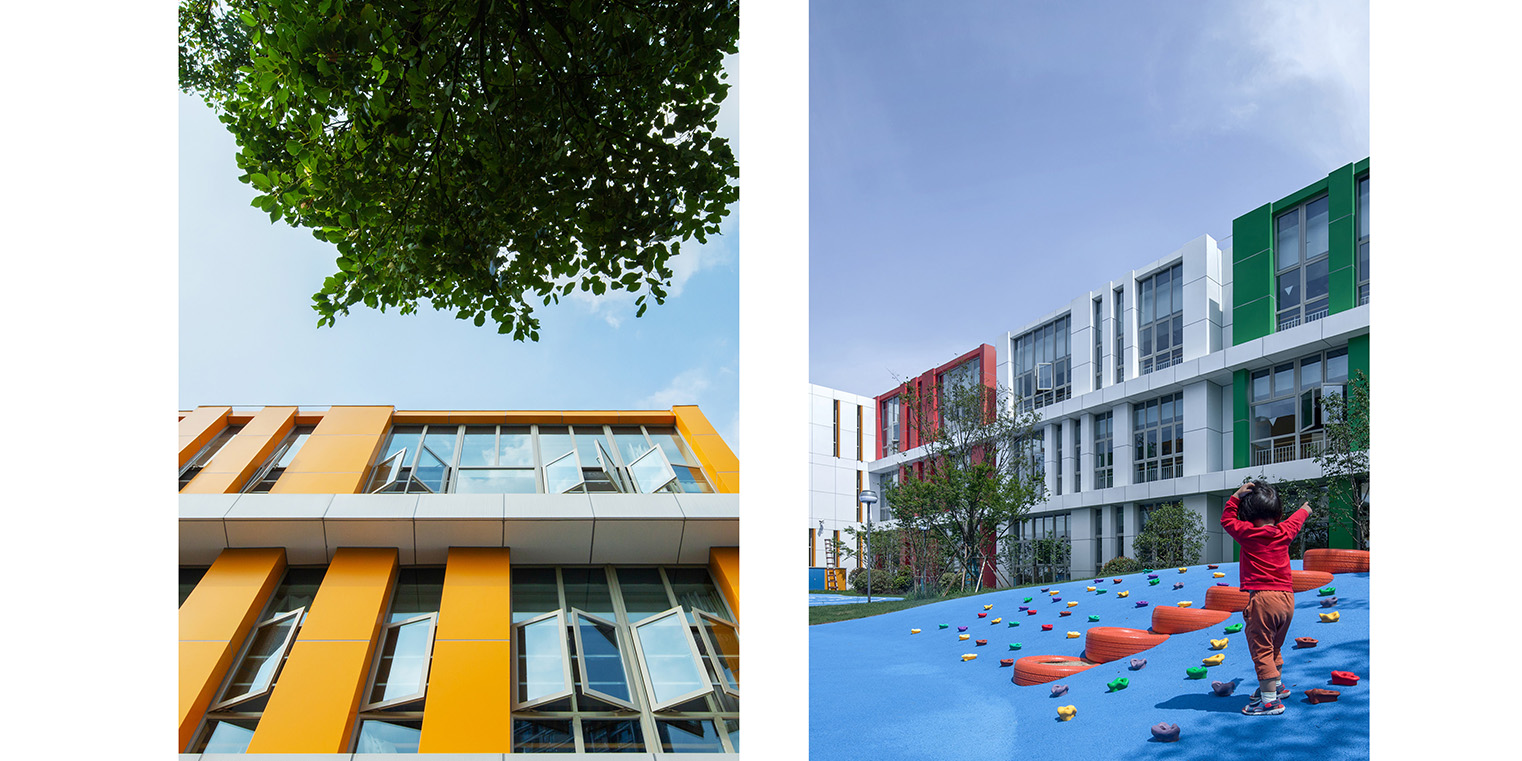 設(shè)計(jì)靈感來(lái)自于英國(guó)著名當(dāng)代藝術(shù)家霍華德·霍奇金的一組作品,其中色塊無(wú)與倫比的表現(xiàn)力,讓建筑師似乎看到了湖邊明媚的陽(yáng)光和絢爛的景色。于是,色塊就成了建筑師給這個(gè)城市空間和幼兒園孩子們的禮物。于是,色塊就成了建筑師給這個(gè)城市空間和幼兒園孩子們的禮物。檸檬黃、橘紅和草綠,是幼兒園入口的主要印象。園中主體的基本教學(xué)單元,上下三層疊加在一起,組成一個(gè)著色單元,每個(gè)相鄰的單元用不同的顏色區(qū)分。在東西側(cè)面上用主色調(diào)的淺色點(diǎn)綴,并用同色系的著色立桿來(lái)勾勒條窗。由于色塊使用了同色系的不同深淺顏色,有層級(jí)地區(qū)分搭配,所以色彩效果特別豐富,而不雜亂。 我們把三排教室和連廊整體在平面上旋轉(zhuǎn)約10度,連廊基本與東邊界平行,這樣計(jì)算出來(lái)的日照結(jié)果,剛好解決了連廊的自遮擋問題,大大改善了三排教室和教室間活動(dòng)場(chǎng)地的日照狀況,還順便擴(kuò)大了最北側(cè)教室樓與入口前道路的距離,改善了幼兒園入口的空間尺寸。我們的設(shè)計(jì),給教室和操場(chǎng),注入了一種“向陽(yáng)而生”的生命力。