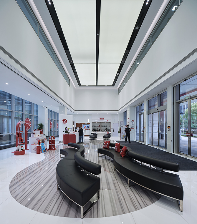設計將整個建筑比作一座“山”,塔樓為主峰,裙房為山麓,建筑東側(cè)的中庭主背景將之看作為山水畫的立軸,正所謂“掛壁飛泉同夜月,月光來處四窗虛”。同時將“垂直園林”的理念引入到中庭空間設計,中庭花園設計取自蘇州園林意象,四個中庭花園分別采用“霧澗聽松”、“竹塢觀石”、“蘭庭問泉”、“溪橋望蓮”的設計概念。大廳設計采用金色金屬與白色石材劃分縱向空間,加強空間層次體塊感,同時大面積金色金屬的運用與浙商銀行的金融屬性相契合。整體空間設計上充分結合項目企業(yè)特性,致力打造一個沉穩(wěn)、簡約、舒適的現(xiàn)代辦公空間。