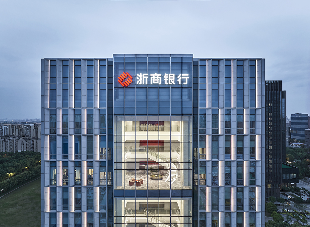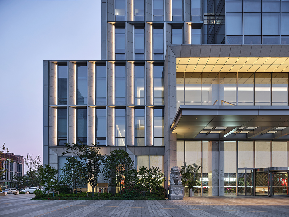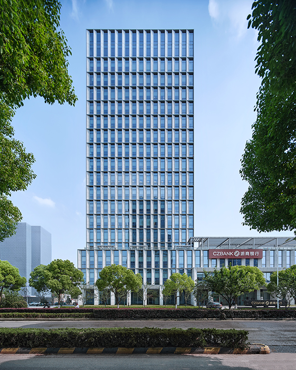 項(xiàng)目位于蘇州工業(yè)園區(qū)旺墩路沿線,總體布局以城市界面和肌理作為切入點(diǎn),建筑東 立面塔樓居于裙房中央布置,形成儀式感和標(biāo)志性較強(qiáng)的對(duì)稱界面,以建筑語(yǔ)匯突出 浙商銀行的企業(yè)形象。