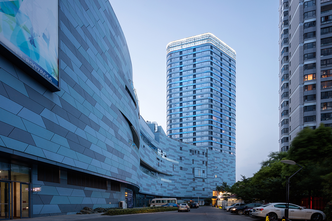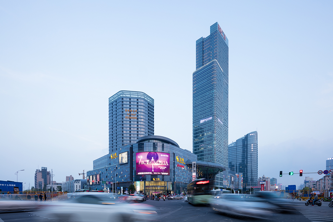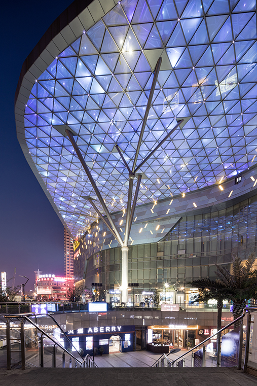 項(xiàng)目位于南通城市南北中軸線交匯的黃金地段,是新老城區(qū)的交匯 點(diǎn)。項(xiàng)目功能為公寓式酒店、辦公和商業(yè)。設(shè)計(jì)構(gòu)思來(lái)源于“鉆石永 恒之美”,結(jié)合鉆石切割的設(shè)計(jì)美學(xué)體現(xiàn)圓融廣場(chǎng)的地標(biāo)價(jià)值與高端 定位。通過(guò)對(duì)三角“鉆石”單元的組合變幻,形成建筑的設(shè)計(jì)亮點(diǎn)。廣 場(chǎng)大屋面由若干三角“鉆石”單元拼合而成,漸變的色彩猶如鉆石各個(gè) 角度折射的光影;流動(dòng)的形體又柔化了“鉆石”自身的堅(jiān)硬感。它們或 透明或鏤空,飄逸靈動(dòng)、輕舞飛揚(yáng)。夜幕降臨,一片片“鉆石”宛若繁 星點(diǎn)點(diǎn),高雅而時(shí)尚?!般@石”屋面延伸至建筑各個(gè)入口,既可作為遮 風(fēng)避雨的設(shè)施,又能提供大面積的城市公共空間。