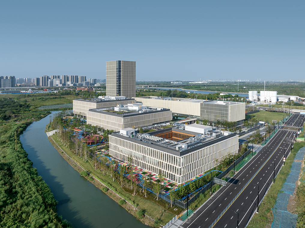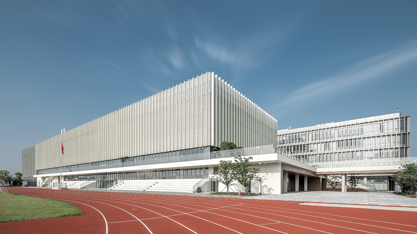 項目位于蘇州市相城區(qū),主要教學(xué)樓分為幼兒園、小學(xué)及初高中三棟樓,建筑體量方正,又由南向北逐級抬高,宛如錯落有序的三個“燈籠”,寓意薈同國際的教學(xué)理念——“點亮求知”。建筑單體多以幕墻及落地玻璃圍合,立面通透,輔以UHPC板造型圍合,呼應(yīng)了符合當?shù)厝宋臍庀⒌奶K式花格窗以及編織造型的燈籠形象。教學(xué)單元與文化體育中心、公寓通過開敞柱廊的串聯(lián),方便了校內(nèi)步行交通的便利性,在空間形式上也對應(yīng)了蘇式園林中廊道的建筑語匯。