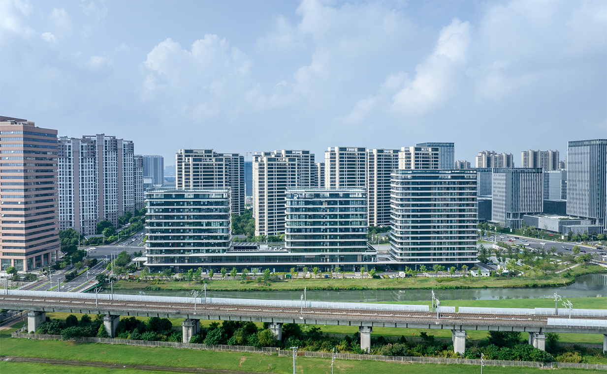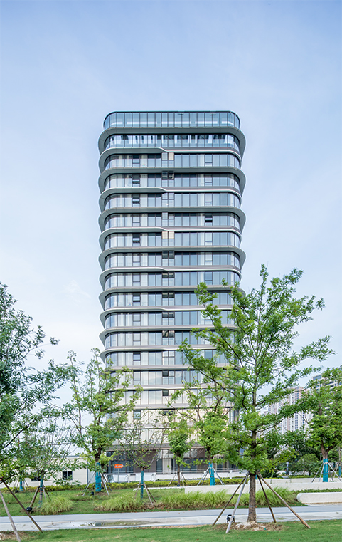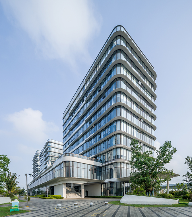 項(xiàng)目總體布局為沿南天成路一字排開(kāi),包含兩棟商務(wù)辦公、一棟公寓式酒店,兩層配套用房作為底座三大部分。項(xiàng)目背靠滬寧鐵路線,有得天獨(dú)厚的地理?xiàng)l件,因此沿南天成路立面上橫向挑檐強(qiáng)化出建筑橫向延展的形態(tài),線腳端部的細(xì)部處理,勾勒出列車(chē)輪廓,體現(xiàn)高鐵車(chē)頭之形,立面構(gòu)成上錯(cuò)動(dòng)布置,與身后高頻率行駛的高鐵列車(chē)交相輝映,蘊(yùn)含高鐵新城的快速發(fā)展之意。