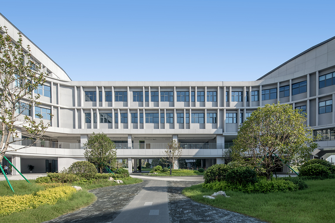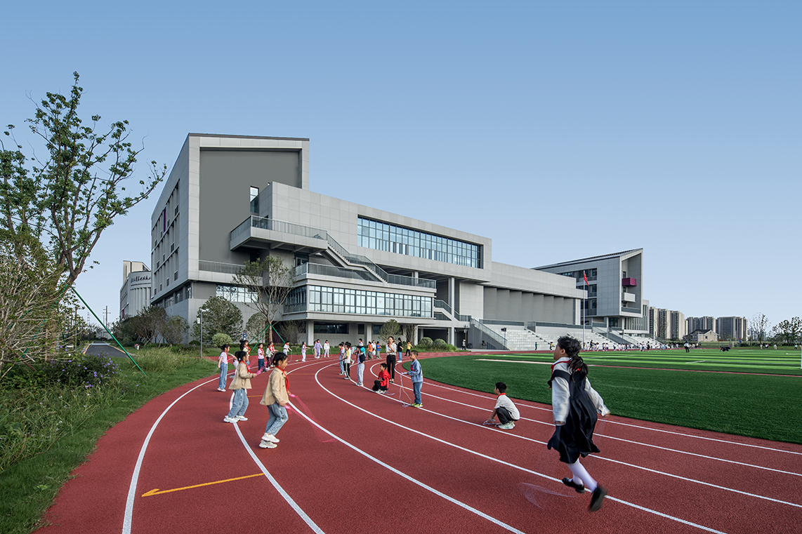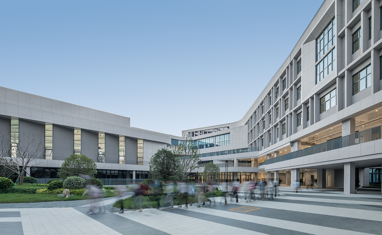 設(shè)計(jì)創(chuàng)新性地抽取了包含專業(yè)教室的綜合樓區(qū)塊,將其融入帶有最大50度轉(zhuǎn)角的曲折走廊設(shè)計(jì)中。這一做法一方面避免了東西向教室的布局,另一方面在提高建筑整體密度的同時(shí),最大化了室外活動(dòng)區(qū)域的面積。通過引入下沉廣場(chǎng)、退臺(tái)式布局以及出挑露臺(tái)等設(shè)計(jì)元素,進(jìn)一步豐富了校園室外活動(dòng)空間的體驗(yàn)層次,為孩子們?cè)鎏砹颂剿髋c發(fā)現(xiàn)的樂趣。