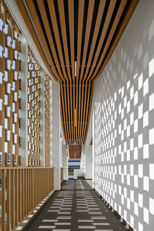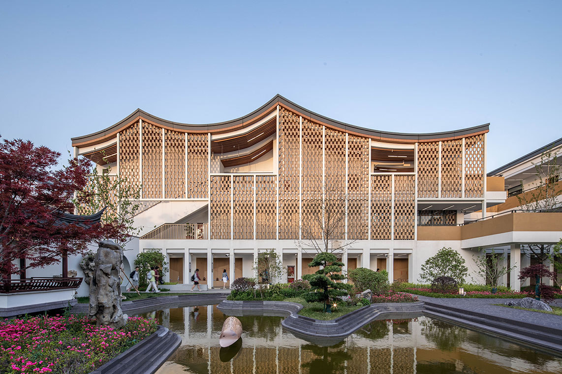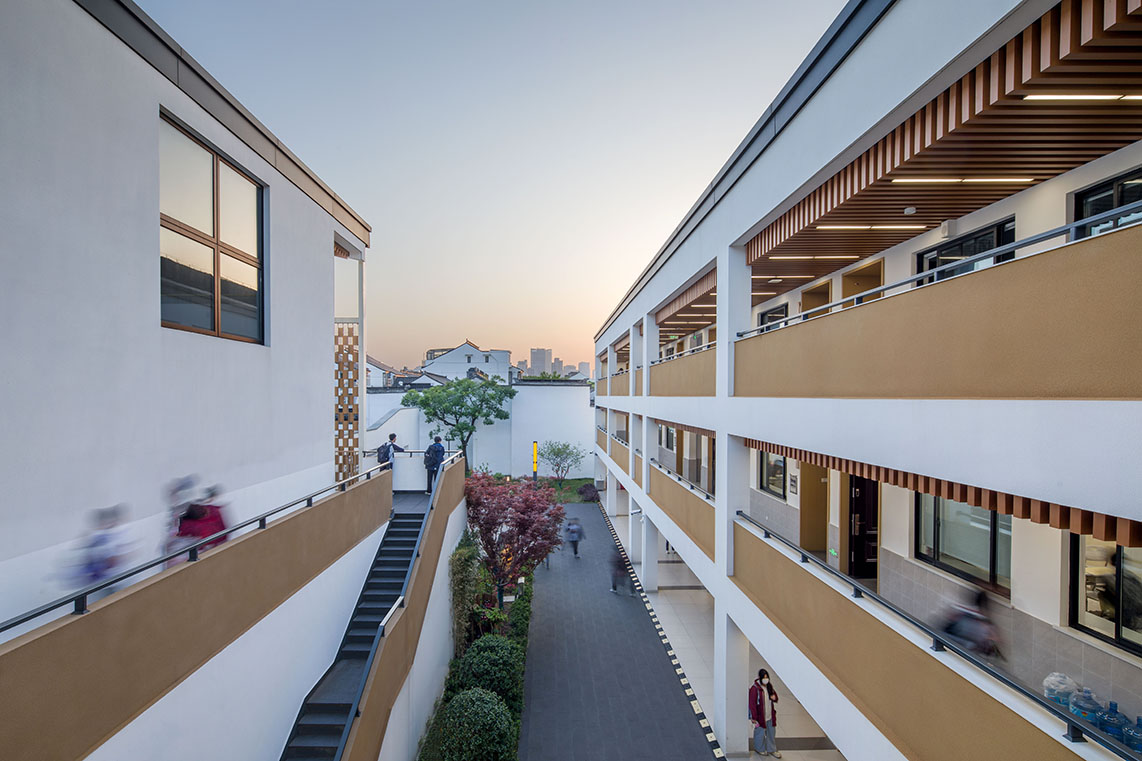 項目秉承“傳承與創(chuàng)新”的理念,在尊重古城風貌和保護周邊控保建筑的前提下,探索新中式學校建筑風格。設計通過對地下空間的利用、相同尺度空間的疊合、立面手法削弱大體量空間尺度感等方式,合理巧妙的把新校區(qū)大尺度功能空間與古城區(qū)小尺度街坊融合在一起,彼此間并不突兀。建筑通過圍合的方式在場地內部留出一處內院,與控保建筑隔墻呼應,結合古城風貌特色打造校園文化園林,讓新建學校與古城街坊融為一體,打造功能完善、環(huán)境優(yōu)美的現(xiàn)代化校園。