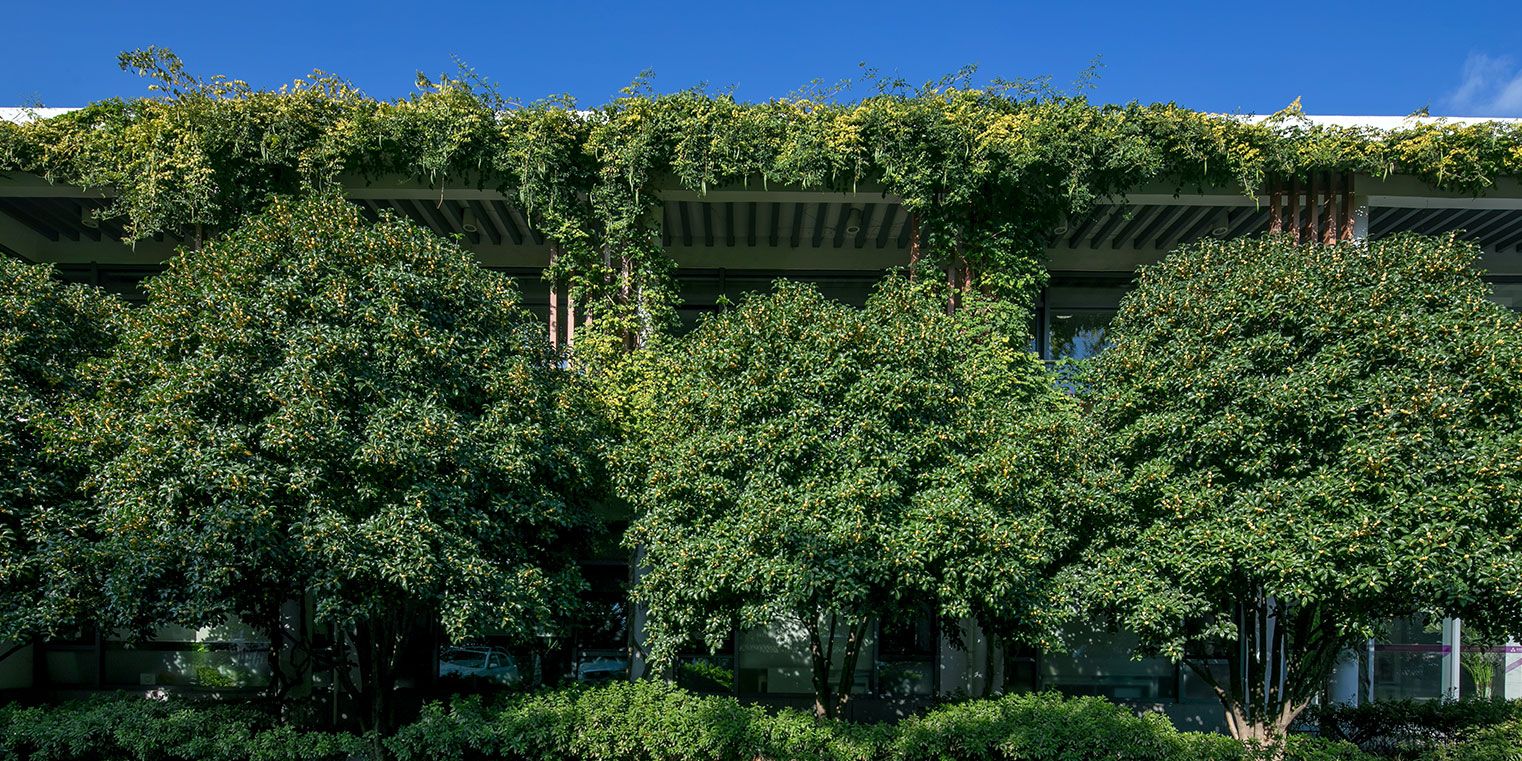 改造后的辦公樓被重重綠意包裹,開(kāi)放庭院貫穿其中,藤架長(zhǎng)廊懸于外墻,高大林木環(huán)立四周。在封閉的廠房建筑中,架構(gòu)起由內(nèi)而外的三重自然空間,江南的傳統(tǒng)氣質(zhì)自然彰顯。這些無(wú)處不在的綠色空間,提供了人與自然親密接觸的可能。在這里,可以放松心情愉悅工作,無(wú)限創(chuàng)意隨時(shí)迸發(fā)。