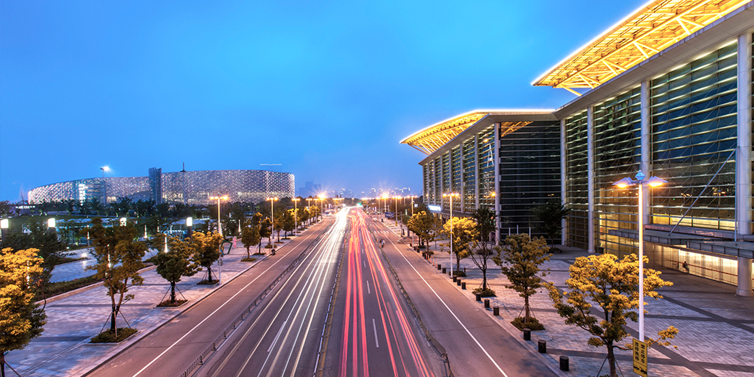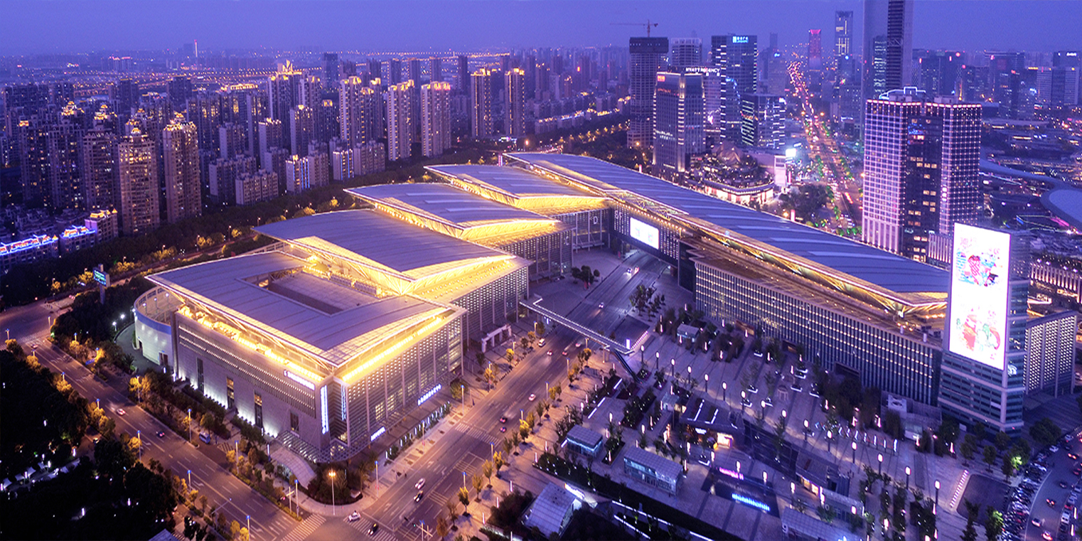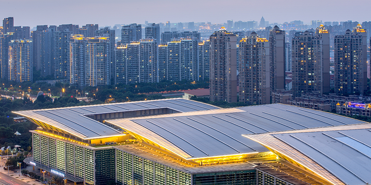 蘇州國際博覽中心位于蘇州工業(yè)園區(qū)金雞湖畔,總體造型像一把打開的蘇州折扇,既時尚又富有蘇州婉約特色。扇片狀的屋頂采用了不銹鋼和玻璃材料,在陽光的照射下閃閃發(fā)光。扇形建筑體量與優(yōu)美的前庭、流動的小河,以及景觀花園、林蔭大道融為一體。