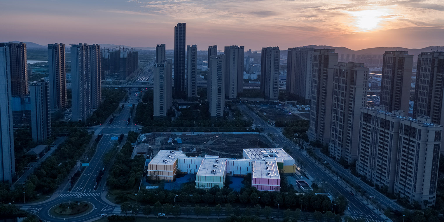 設(shè)計(jì)靈感來(lái)自于英國(guó)著名當(dāng)代藝術(shù)家霍華德·霍奇金的一組作品,其中色塊無(wú)與倫比的表現(xiàn)力,讓建筑師似乎看到了湖邊明媚的陽(yáng)光和絢爛的景色。于是,色塊就成了建筑師給這個(gè)城市空間和幼兒園孩子們的禮物。于是,色塊就成了建筑師給這個(gè)城市空間和幼兒園孩子們的禮物。檸檬黃、橘紅和草綠,是幼兒園入口的主要印象。園中主體的基本教學(xué)單元,上下三層疊加在一起,組成一個(gè)著色單元,每個(gè)相鄰的單元用不同的顏色區(qū)分。在東西側(cè)面上用主色調(diào)的淺色點(diǎn)綴,并用同色系的著色立桿來(lái)勾勒條窗。由于色塊使用了同色系的不同深淺顏色,有層級(jí)地區(qū)分搭配,所以色彩效果特別豐富,而不雜亂。 我們把三排教室和連廊整體在平面上旋轉(zhuǎn)約10度,連廊基本與東邊界平行,這樣計(jì)算出來(lái)的日照結(jié)果,剛好解決了連廊的自遮擋問題,大大改善了三排教室和教室間活動(dòng)場(chǎng)地的日照狀況,還順便擴(kuò)大了最北側(cè)教室樓與入口前道路的距離,改善了幼兒園入口的空間尺寸。我們的設(shè)計(jì),給教室和操場(chǎng),注入了一種“向陽(yáng)而生”的生命力。
